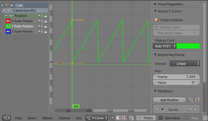 Now, as the frame changes from 1 to 60, you should see the object go through a complete rotation. If you click the playback button starting in frame 0, you will notice that the rotation starts out slow, speeds up, then slows down again at the end. This is reasonable for an object that starts out at rest, then goes through one rotation, and stops at the end. But suppose you really want a constant speed of rotation? The question is, how does the computer interpolate between the keyframes? The interpolation is controlled by the F-curves.