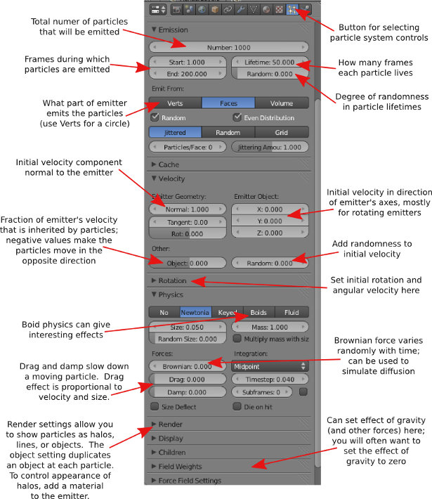 A particle system is a bunch of free-floating vertices that move under the influence of forces or other controls. Particle systems can represent everything from a cloud of smoke to a flock of birds. So-called "Hair" particle systems, in which the entire path of each particle is rendered at once, can be used to simulate things like hair and grass. Blender particle systems are very complicated, and I will only mention a few of the options here.