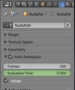 By default, the object—actually, the point at which the object is attached to the path—moves along the path from beginning to end between frame 1 and frame 100. You can change the length of the animation in the path's Object Data control panel, under "Path Animation," as shown in the picture below. Generally, you will want to increase the number of frames significantly. Remember that 100 frames is only about 4 seconds!