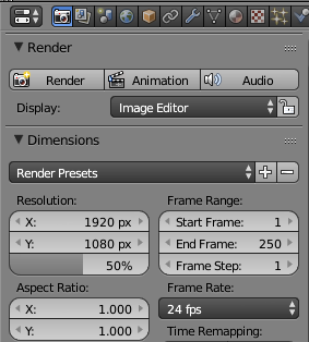The Render panel controls rendering of individual images as well as animations. At the top of the Render control panel are "Render" and "Animation" buttons that can be used to render an individual image or an animation. (These buttons duplicate the F12 key and the render commands in the menu bar.) The "Resolution" section controls the size of the image that will be produced. You can specify the X and Y dimensions, in pixels, and also a percentage; the stated dimensions are multiplied by the percentage to get the actual image size (presumably to make it easy to make small size test runs). The "Frame Range" duplicates the animation start and end frames from the timeline at the bottom of the Blender window. Note that the "Frame Step" lets you render just a subset of the frames. For example, set it to 2 to render every other frame; again, this can be used to speed things up for test runs.
