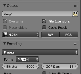 To set the output destination, enter a directory name in the box just below the word "Output". You can add a file name to the output destination; Blender will add frame numbers and a file extension to the name. If the destination is a directory name, ending in a slash, Blender will make up the file name. Click the folder icon at the right end of the input box to select the destination using a file browser window. Note that the default output destination is shown as the /tmp directory, and you will probably want to change that. (You can change the default directory for render output, and lots of other settings, using "User Preferences", in the "File" menu.)