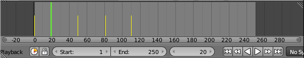 On the bottom of the timeline panel, you see the starting frame, the end frame, and the current frame of the animation (1, 250, and 20 in the picture). The current frame number specifies the frame that is displayed in the 3D View. These are numerical input buttons that you can edit. To the right of the frame number buttons is a set of playback controls, which run the animation in the 3D View window. The start and end frames are used when you use the playback buttons. They also determine what frames will be included when you render an animation. Note that 250 frames make a rather short animation when viewed at a typical 30 or 60 frames per second.