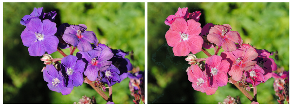 As an example, I used the "Hue-Saturation" dialog to change the color of the flowers in an image from purple to pink: