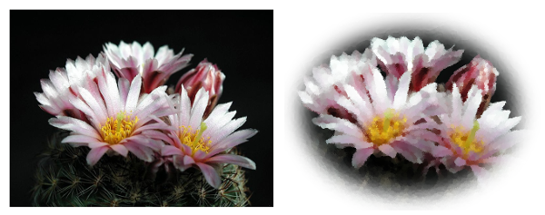 The original image is, again, a public-domain image from Wikimedia Commons. I started with an elliptical selection around the flowers in the original image. In the Tool Options for the Elliptical Selection tool, the "Feather Edges" option was set to 40. I then applied the "Invert" command from the "Select" menu, which inverted the selection so that the outside of the ellipse was selected instead of the inside. Finally, I used "Cut" to delete the selected region, leaving just the flowers, with a 40-pixel border in which the flowers fade into the background. (Note: To add some visual interest to the image, I applied the "Artistic" / "Oilify" filter to the original before doing the selection.)