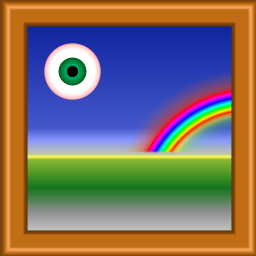 For this picture, the background was made by selecting the gradient named "Land and Sea", setting the gradient Shape set to "Linear", and dragging the mouse from the bottom of the image to the top. The frame around the edges was made using the "Square Wood Frame" gradient with the Shape option set to "Square". Much of the "Square Wood Frame" gradient is transparent. The frame was made by dragging the mouse from the center of the image to the edge, but the only opaque part of the gradient was near the edges. The eye was made using a "Radial Eyeball" gradient with the shape set to "Radial". And the rainbow used the "Radial Rainbow Hoop" gradient with the shape set to "Radial." A rectangular selection was used while creating the rainbow. Without the selection, the rainbow would have been a full circle. However, only part of that circle was inside the selection, so only that part was drawn.