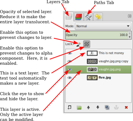 It is important to understand that only one layer can be edited at any given time. That layer is called the active layer. This can be annoying if you lose track of which layer is active. It can be especially annoying if the active layer is hidden in the visible image or has been made completely transparent!
