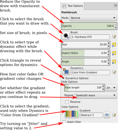 Below the Toolbox is the "Tool Options" dialog, which contains options for the drawing tool that is currently selected. The contents of the dialog change when you select a new tool. Here, for example, are the options for the Brush tool, which is used for painting on an image in the usual sense. The Brush is probably the most basic and useful tool: