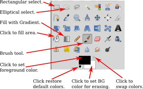 Gimp has a wide variety of tools, which you can find in the "Toolbox" in the upper left corner of the window. (My discussion here assumes that you are working in single-window mode, with the window in its original configuration.) You can hover your mouse over a tool button to find out what the tool is for. Click a button to select a tool. Click or drag the mouse on an image window to apply the selected tool. The Toolbox also has buttons for controlling the foreground and background color. Here is an illustration of the Toolbox with a few annotations: