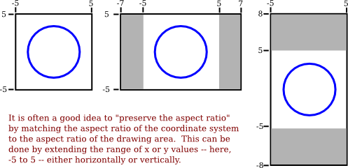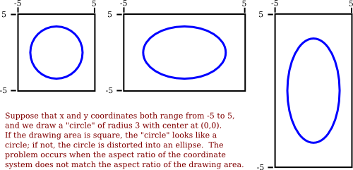 If the coordinate system is used on a rectangle with the same aspect ratio, then when viewed in that rectangle, one unit in the horizontal direction will have the same apparent length as a unit in the vertical direction. If the aspect ratios don't match, then there will be some distortion. For example, the shape defined by the equation x2 +y2 = 9 should be a circle, but that will only be true if the aspect ratio of the (x,y) coordinate system matches the aspect ratio of the drawing area.