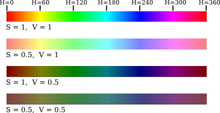 Let's look at some colors in the HSV color model. The illustration below shows colors with a full range of H-values, for S and V equal to 1 and to 0.5. Note that for S=V=1, you get bright, pure colors. S=0.5 gives paler, less saturated colors. V=0.5 gives darker colors.