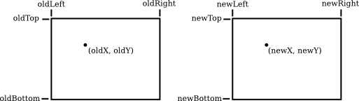 As an example, suppose that we want to transform some real-number coordinate system with limits left, right, top, and bottom into pixel coordinates that range from 0 at left to 800 at the right and from 0 at the top 600 at the bottom. In that case, newLeft and newTop are zero, and the formulas become simply