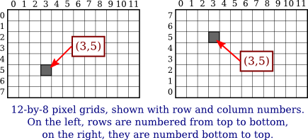 A digital image is made up of rows and columns of pixels. A pixel in such an image can be specified by saying which column and which row contains it. In terms of coordinates, a pixel can be identified by a pair of integers giving the column number and the row number. For example, the pixel with coordinates (3,5) would lie in column number 3 and row number 5. Conventionally, columns are numbered from left to right, starting with zero. Most graphics systems, including the ones we will study in this chapter, number rows from top to bottom, starting from zero. Some, including OpenGL, number the rows from bottom to top instead.