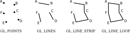 There are three primitives for drawing line segments: GL_LINES, GL_LINE_STRIP, and GL_LINE_LOOP. GL_LINES draws disconnected line segments; specify two vertices for each segment that you want to draw. The other two primitives draw connected sequences of line segments. The only difference is that GL_LINE_LOOP adds an extra line segment from the final vertex back to the first vertex. Here is what you get if use the same six vertices with the four primitives we have seen so far: