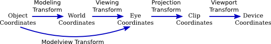 Note, by the way, that OpenGL doesn't keep track of separate modeling and viewing transforms. They are combined into a single transform, which is known as the modelview transformation. In fact, even though world coordinates might seem to be the most important and natural coordinate system, OpenGL doesn't have any representation for them and desn't use them internally. For OpenGL, only object and eye coordinates have meaning. OpenGL goes directly from object coordinates to eye coordinates by applying the modelview transformation.