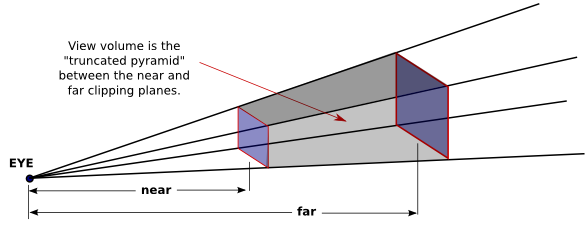 However, OpenGL can't actually show everything in this pyramid, because of its use of the depth test to solve the hidden surface problem. Since the depth buffer can only store a finite range of depth values, it can't represent the entire range of depth values for the infinite pyramid that is theoretically in view. Only objects in a certain range of distances from the viewer can be part of the image. That range of distances is specified by two values, near and far. For a perspective transformation, both of these values must be positive numbers, and far must be greater than near. Anything that is closer to the viewer than the near distance or farther away than the far distance is discarded and does not appear in the rendered image. The volume of space that is represented in the image is thus a "truncated pyramid." This pyramid is the view volume for a perspective projection: