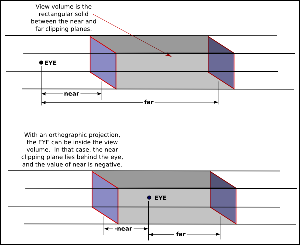 In fact, it's not really clear what it means to say that there is a viewer in the case of orthographic projection. Nevertheless, for orthographic projection in OpenGL, there is considered to be a viewer. The viewer is located at the eye-coordinate origin, facing in the direction of the negative z-axis. Theoretically, a rectangular corridor extending infinitely in both directions, in front of the viewer and in back, would be in view. However, as with perspective projection, only a finite segment of this infinite corridor can actually be shown in an OpenGL image. This finite view volume is a parallelepiped—a rectangular solid—that is cut out of the infinite corridor by a near clipping plane and a far clipping plane. The value of far must be greater than near, but for an orthographic projection, the value of near is allowed to be negative, putting the "near" clipping plane behind the viewer, as shown in the lower section of this illustration: