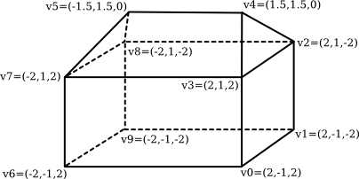 Vertex #0. (2, -1, 2) Vertex #1. (2, -1, -2) Vertex #2. (2, 1, -2) Vertex #3. (2, 1, 2) Vertex #4. (1.5, 1.5, 0) Vertex #5. (-1.5, 1.5, 0) Vertex #6. (-2, -1, 2) Vertex #7. (-2, 1, 2) Vertex #8. (-2, 1, -2) Vertex #9. (-2, -1, -2)