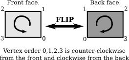 Again, the order in which the faces are listed in arbitrary. There is also some freedom in how the vertices for a face are listed. You can start with any vertex. Once you've picked a starting vertex, there are two possible orderings, corresponding to the two possible directions in which you can go around the circumference of the polygon. For example, starting with vertex 0, the first face in the list could be specified either as (0,1,2,3) or as (0,3,2,1). However, the first possibility is the right one in this case, for the following reason. A polygon in 3D can be viewed from either side; we can think of it as having two faces, facing in opposite directions. It turns out that it is often convenient to consider one of those faces to be the "front face" of the polygon and one to be the "back face." For a polyhedron like the house, the front face is the one that faces the outside of the polyhedron. The usual rule is that the vertices of a polygon should be listed in counter-clockwise order when looking at the front face of the polygon. When looking at the back face, the vertices will be listed in clockwise order. This is the default rule used by OpenGL.