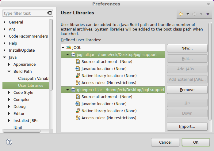 I do most of my Java development using the Eclipse IDE (http://eclipse.org). To do development with JOGL in Eclipse, you will have to configure Eclipse with information about the jar files. To do that, start up Eclipse. You want to create a "User Library" to contain the jar files: Open the Eclipse Preferences window, and select "Java" / "Build Path" / "User Libraries" on the left. Click the "New" button on the right. Enter "JOGL" (or any name you like) as the name of the user library. Make sure that the new user library is selected in the list of libraries, then click the "Add External Jars" button. In the file selection box, navigate to the directory that contains the JOGL jar files, and select the two jar files that are needed for JOGL, jogl-all.jar and gluegen-rt.jar. (Again, you do not need to add the native libraries; they just need to be in the same directory as the JOGL jar files.) Click "Open." The selected jars will be added to the user library. (You could also add them one at a time, if you don't know how to select multiple files.) It should look something like this: