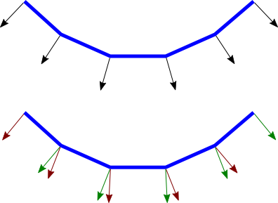 The two objects in this picture are made up of bands of rectangles. The two objects have exactly the same geometry, yet they look quite different. This is because different normal vectors are used in each case. For the top object, the band of rectangles is supposed to approximate a smooth surface. The vertices of the rectangles are points on that surface, and I really didn't want to see the rectangles at all—I wanted to see the curved surface, or at least a good approximation. So for the top object, when I specified the normal vector at each of the vertices, I used a vector that is perpendicular to the surface rather than one perpendicular to the rectangle. For the object on the bottom, on the other hand, I was thinking of an object that really is a band of rectangles, and I used normal vectors that were actually perpendicular to the rectangles. Here's a two-dimensional illustration that shows the normal vectors that were used for the two pictures: