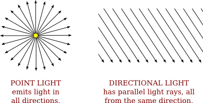 Leaving aside ambient light, the light in an environment comes from a light source such as a lamp or the sun. In fact, a lamp and the sun are examples of two essentially different kinds of light source: a point light and a directional light. A point light source is located at a point in 3D space, and it emits light in all directions from that point. For a directional light, all the light comes from the same direction, so that the rays of light are parallel. The sun is considered to be a directional light source since it is so far away that light rays from the sun are essentially parallel when they get to the Earth .