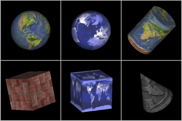 Uniformly colored 3D objects look nice enough, but they are a little bland. Their uniform colors don't have the visual appeal of, say, a brick wall or a plaid couch. Three-dimensional objects can be made to look more interesting and more realistic by adding a texture to their surfaces. A texture, in general, is some sort of variation from pixel to pixel within a single primitive. We will consider only one kind of texture: image textures. An image texture can be applied to a surface to make the color of the surface vary from point to point, something like painting a copy of the image onto the surface. Here is a picture that shows six objects with various image textures: