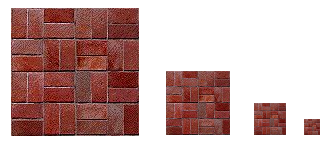A mipmap for a texture is a scaled-down version of that texture. A complete set of mipmaps consists of the full-size texture, a half-size version in which each dimension is divided by two, a quarter-sized version, a one-eighth-sized version, and so on. If one dimension shrinks to a single pixel, it is not reduced further, but the other dimension will continue to be cut in half until it too reaches one pixel. In any case, the final mipmap consists of a single pixel. Here are the first few images in the set of mipmaps for a brick texture:
