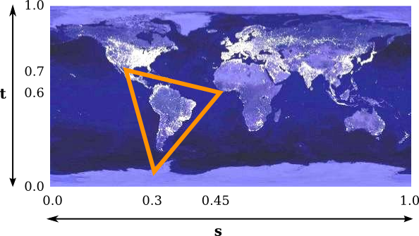 To draw a textured primitive, we need a pair of numbers (s,t) for each vertex. These are the texture coordinates for that vertex. They tell which point in the image is mapped to the vertex. For example, suppose that we want to apply part of an EarthAtNight image to a triangular primitive. Let's say that the area in the image that is to be mapped onto the primitive is the triangle shown here outlined in thick orange: