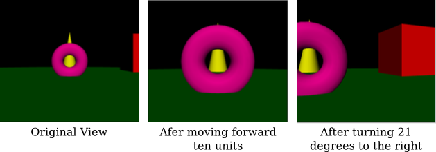 For the third image, the camera has rotated in place by 21 degrees to the right—a 21-degree clockwise rotation about the y-axis—after it has been translated. This can be implemented by the transformation glRotatef(21,0,1,0)—a 21-degree counterclockwise rotation about the y-axis—applied before the translation. Remember that the inverse of a composition of transformations is the composition of their inverses, in the opposite order. Mathematically, using T−1 to represent the inverse of a transformation T, we have that (RS)−1 = S−1R−1 for two transformations R and S.
