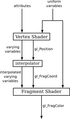 After the positions of all the vertices in the primitive have been computed, a fixed-function stage in the pipeline clips away the parts of the primitive whose coordinates are outside the range of valid clip coordinates (−1 to 1 along each coordinate axis). The primitive is then rasterized; that is, it is determined which pixels lie inside the primitive. The fragment shader is then called once for each pixel that lies in the primitive. The fragment shader has access to uniform variables (but not attributes). It can also use a special variable named gl_FragCoord that contains the clip coordinates of the pixel. Pixel coordinates are computed by interpolating the values of gl_Position that were specified by the vertex shader. The interpolation is done by another fixed-function stage that comes between the vertex shader and the fragment shader.