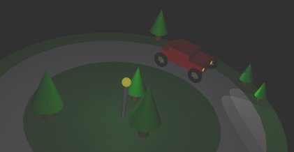 The scene shows a red "car" traveling around the edge of a disk-shaped "world." In the new version, there is a sun that rotates around the world. The sun is turned off at night, when the sun is below the disk. (Since there are no shadows, if the sun were left on at night, it would shine up through the disk and illuminate objects from below.) At night, the headlights of the car turn on. They are implemented as spotlights that travel along with the car; that is, they are subject to the same modelview transformation that is used on the car. Also at night, a lamp in the center of the world is turned on. Light attenuation is used for the lamp, so that its illumination is weak except for objects that are close to the lamp. Finally, there is dim viewpoint light that is always on, to make sure that nothing is ever in absolute darkness. Here is a night scene from the program, in which you can see how the headlights illuminate the road and the trees, and you can probably see that the illumination from the lamp is stronger closer to the lamp:
