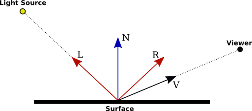 where s is the specular exponent (the material property called "shininess" in OpenGL). The formula is only valid if R·V is greater than zero; otherwise, the specular contribution is zero.