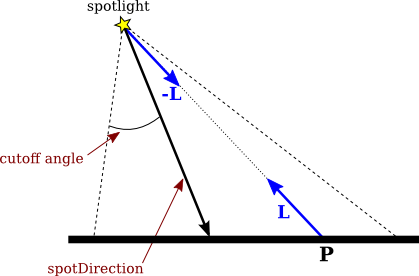 Suppose that we want to apply the lighting equation to a spotlight. Consider a point P on a surface. The lighting equation uses a unit vector, L, that points from P towards the light source. For a spotlight, we need a vector that points from the light source towards P; for that we can use −L. Consider the angle between −L and the spot direction. If that angle is greater than the cutoff angle, then P gets no illumination from the spotlight. Otherwise, we can compute the cosine of the angle between −L and the spot direction as the dot product −D·L, where D is a unit vector that points in the spot direction.