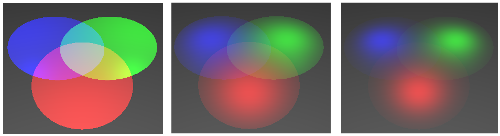 This illustration shows three spotlights shining on a surface; the images are taken from the sample program webgl/spotlights.html: